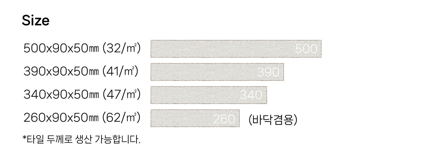 4 가지 사이즈로 제작되며 및 타일두께도 생산합니다.